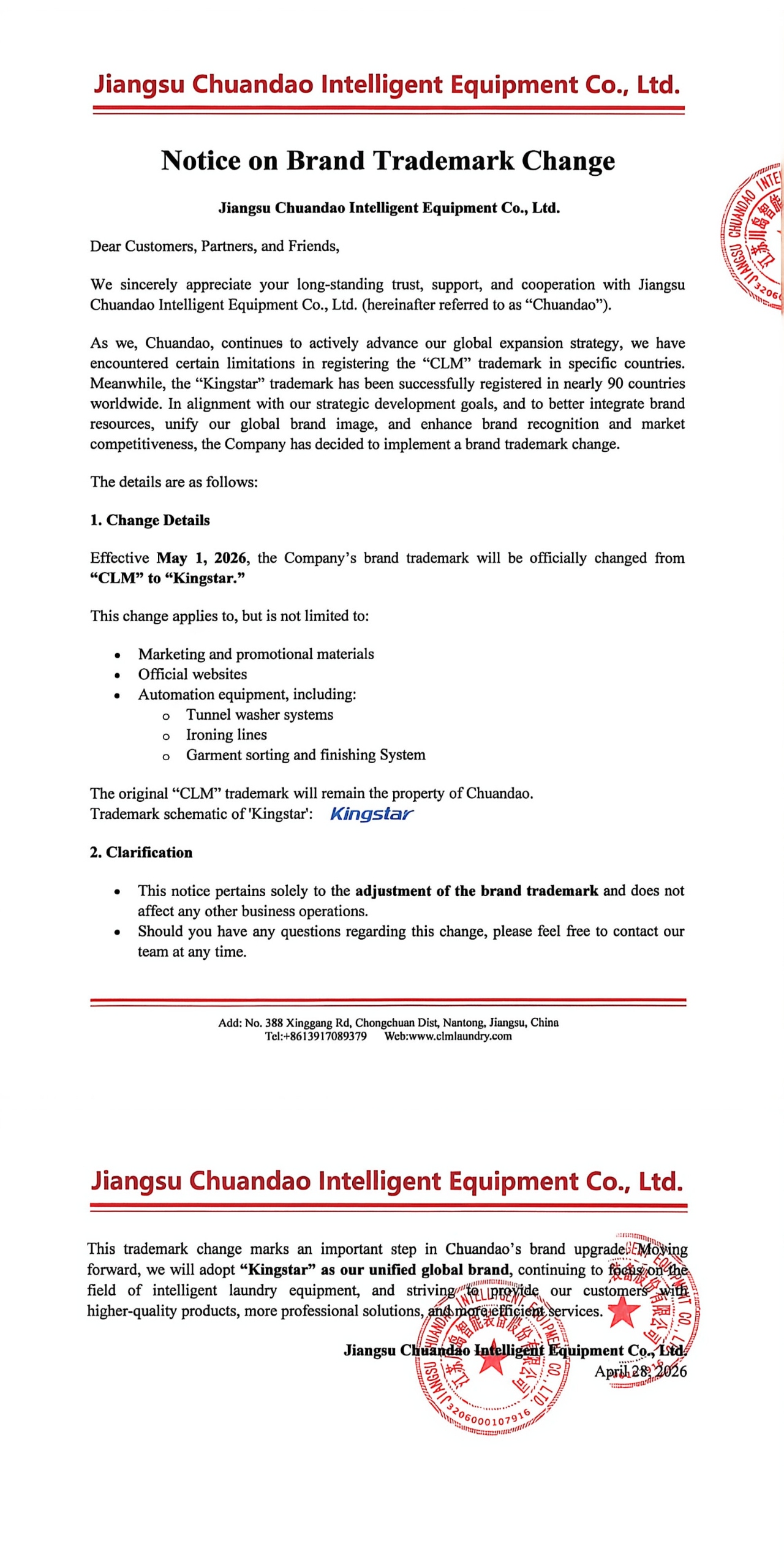 Effective May 1, 2026, the Company’s brand trademark will be officially changed from “CLM” to “Kingstar.”